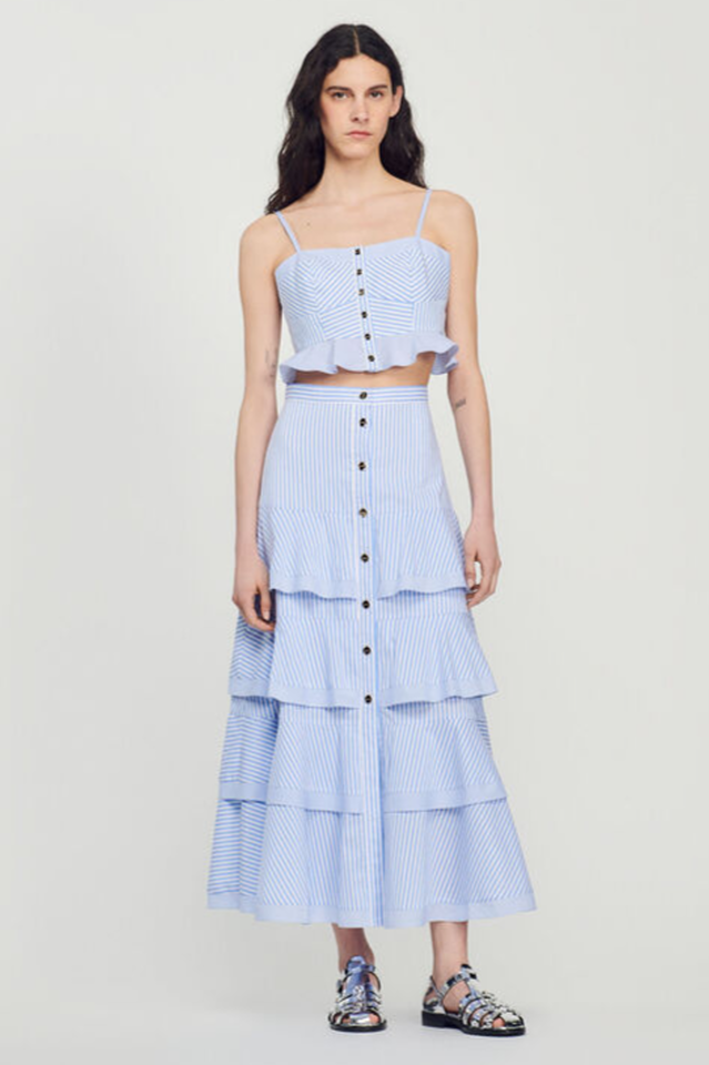 Long skirt with a slightly flared shape. ruffles. a button fastening and a striped print.