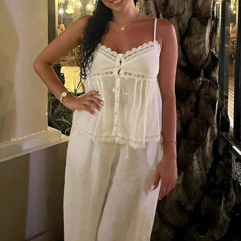 Get swept away in summer's sweetest breeze with this effortlessly romantic lace cami top. Its delicate scalloped trim. button-down front. and sheer cotton blend give it a dreamy charm that feels like golden hour on your skin.