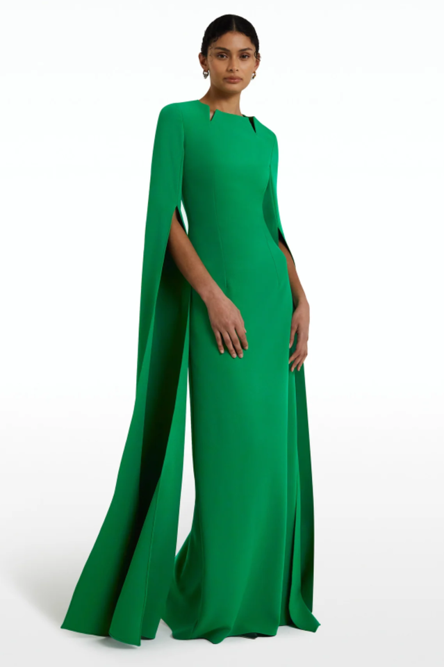Slashed neck long dress with floor length sleeve in heavy crepe.