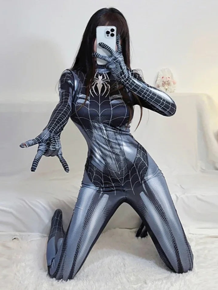 The suit features a glossy black finish with intricate web patterns and a bold spider emblem at the centre.