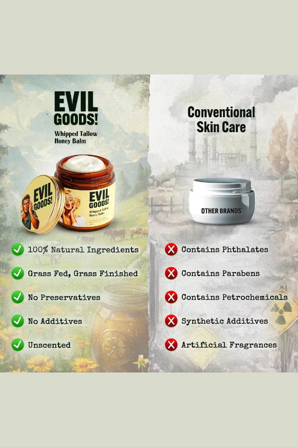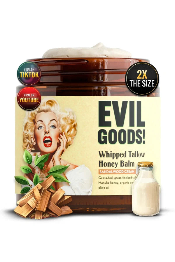 Evil Goodsâ„?- Whipped Beef Tallow and Manuka Honey Balm Elixir. a skin cream that's as pure as it is effective. We believe that what you put on your body is just as important as what you put in it. Evil Goodsâ„?- Whipped Beef Tallow and Manuka Honey Balm Elixir is packed with skin-loving nutrients like vitamins D and E. choline. and essential fatty acids.