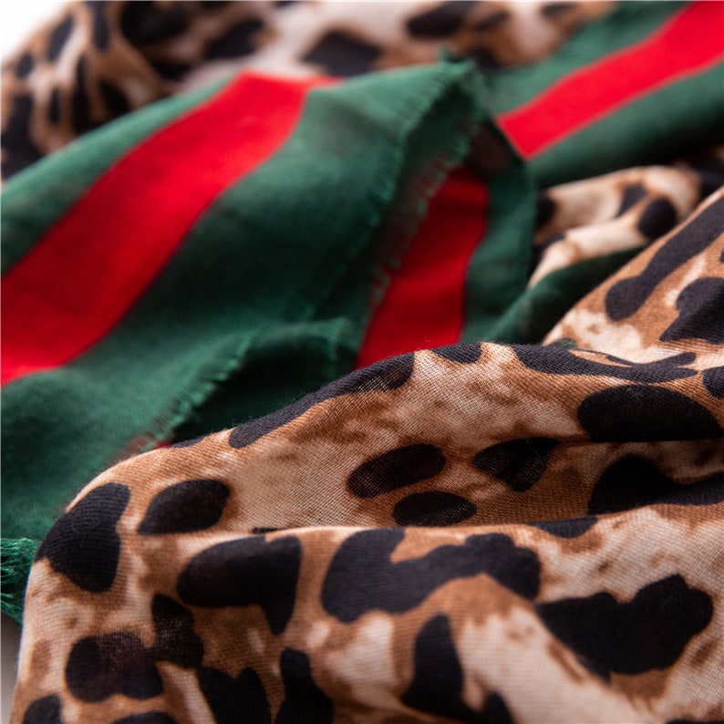 With a bold green and red border stripe and a stunning colorful leopard print all over. this scarf will make you stand out with style.