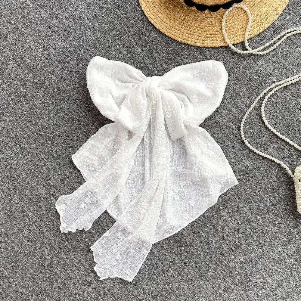 Embrace a touch of delicate romance with this ethereal bow tube top. Crafted from a lightweight. subtly textured fabric in a soft. neutral hue. this top features a dramatic. oversized bow that can be tied in various ways to suit your personal style. Its flowing silhouette and breathable material make it perfect for adding a touch of feminine elegance to any occasion.