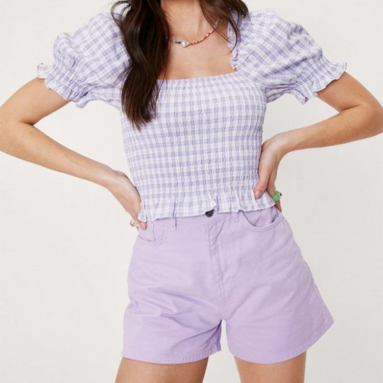 Design: Gingham. Checkered. Oversized. Ruched. Puff Sleeve. Scrunched and Casual Style.