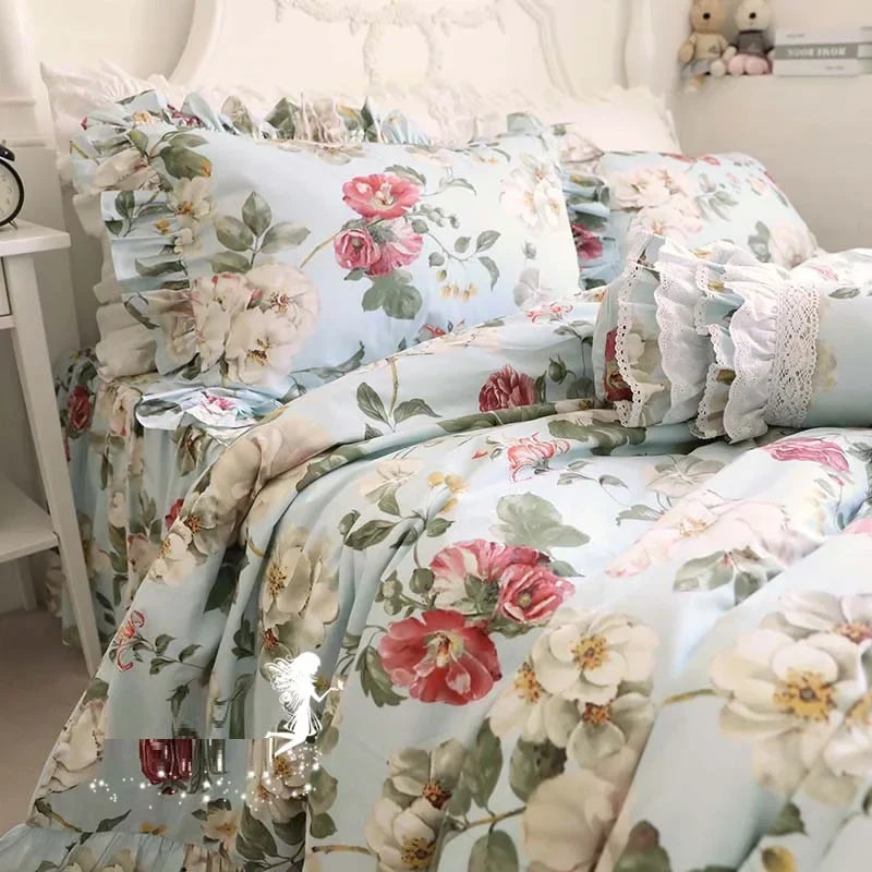 Yeknu Korean 100% Cotton Floral Bedding Set Flounced Rural European Garden Cotton 4pcs Set Cake Layer Ruffles Duvet Cover King Queen