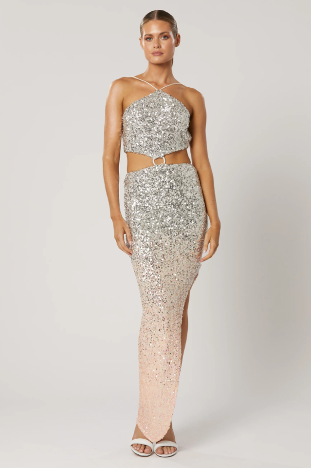 · Finished in ombre micro-sequin textile on stretch mesh base